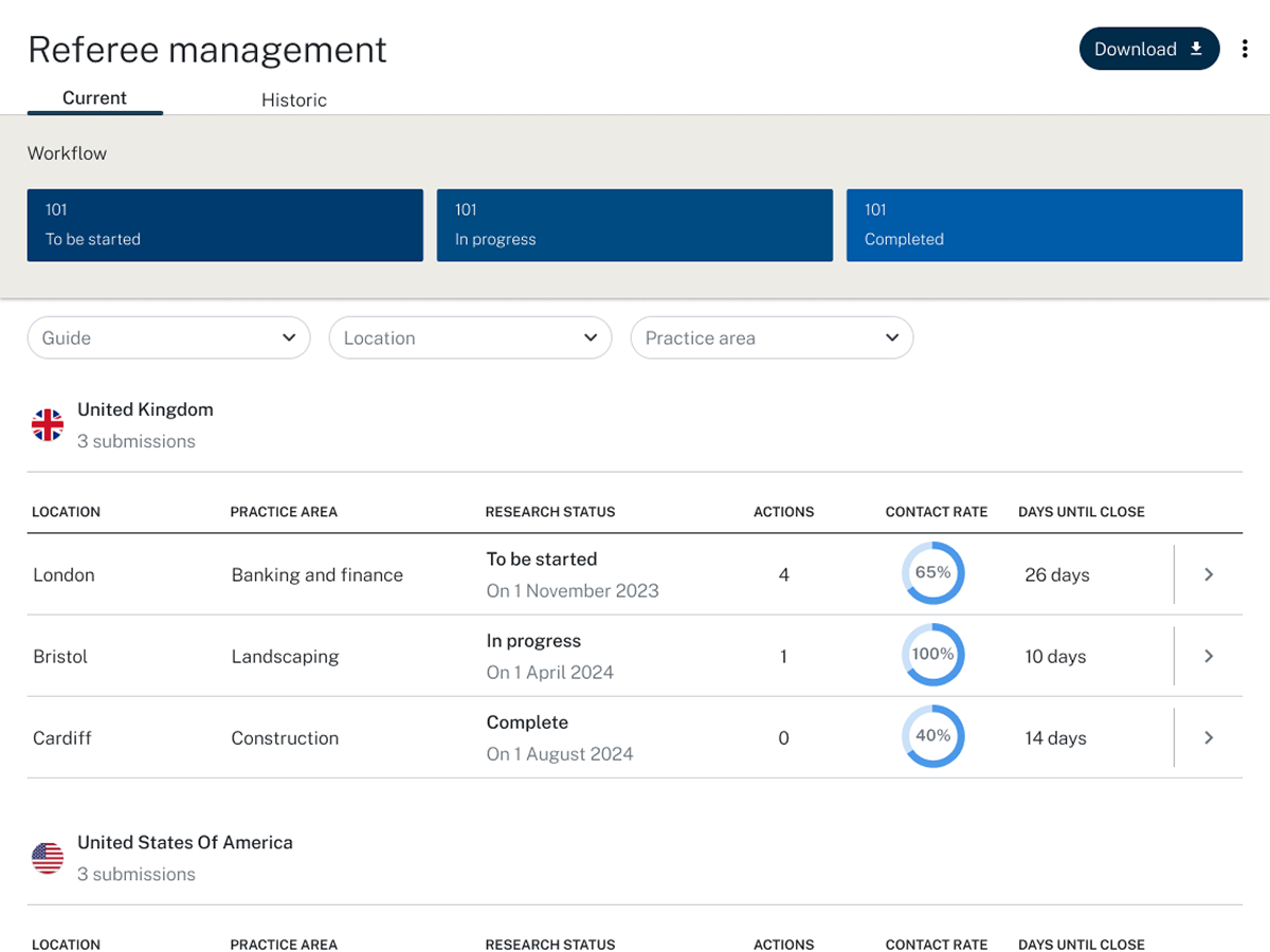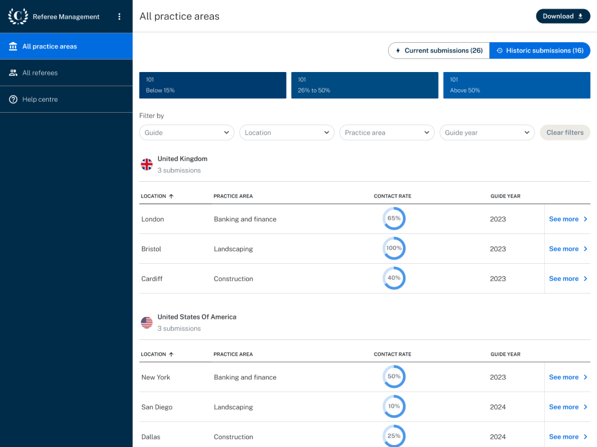 High-impact products such as Referee Management and the Rankings Data Hub — which demonstrated strong user engagement and alignment with business targets — were prioritised for enhancement. Expanding the functionality of these platforms became a strategic focus to further strengthen the value proposition of a Chambers subscription for law firms.